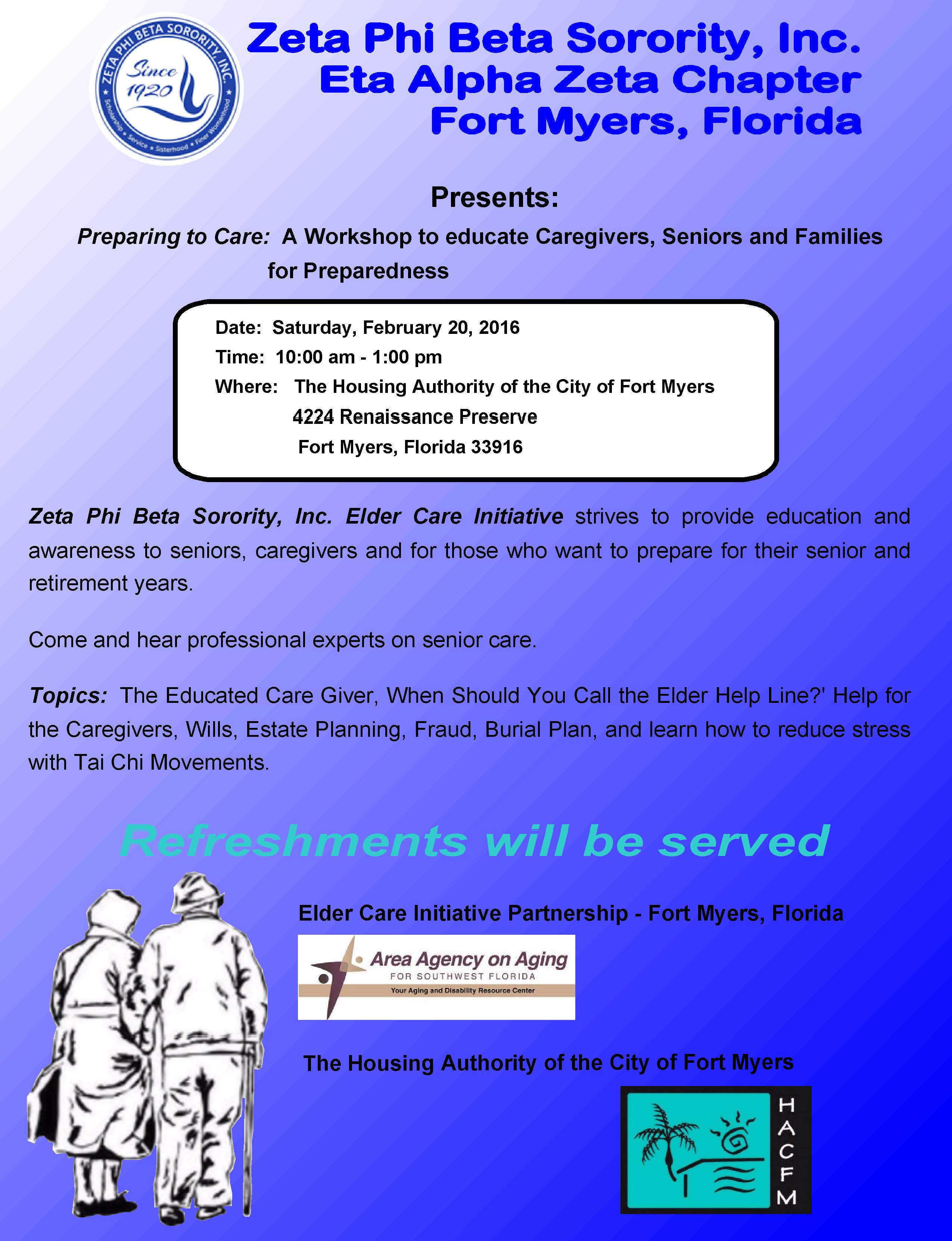 Zeta Phi Beta Sorority, Inc.’s Elder Care Initiative is partnering with the Area Agency on Aging for SWFL to provide education and  awareness to seniors, caregivers and those who want to prepare for their senior and retirement years.