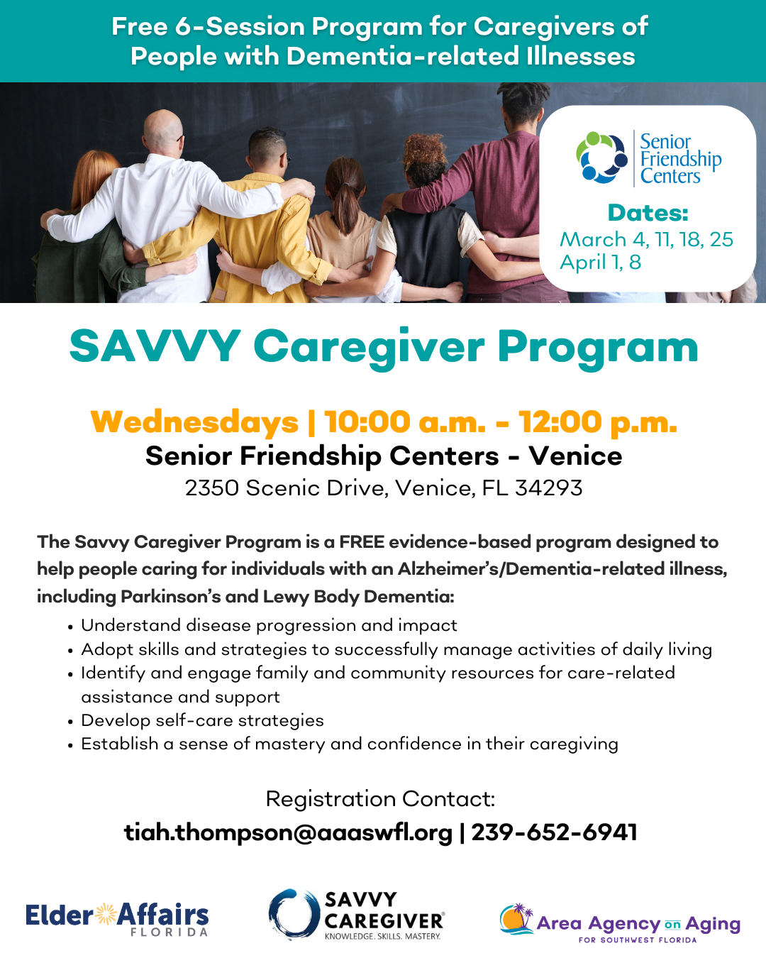 Program sessions will be held on Wednesdays from March 4 – April 8. Registration contact: tiah.thompson@aaaswfl.org or call 239-652-6941.