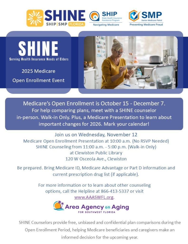 Bring Medicare ID, Medicare Advantage or Part D information and current prescription drug list. (Walk-ins Only)