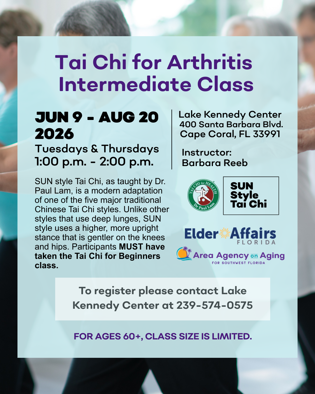 Classes take place on Tuesdays and Thursdays beginning June 9 – August 20. To register contact Lake Kennedy Center at 239-574-0575. Participants must have taken the tai chi for beginners class.