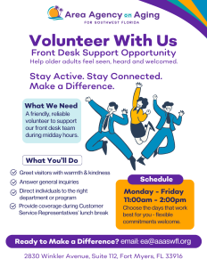 At the Area Agency on Aging for Southwest Florida (AAASWFL), every person who walks through our doors deserves to feel supported from the very first moment. For many older adults, caregivers, and community members, that first moment happens at our front desk — where a warm smile and a kind voice can make all the difference.